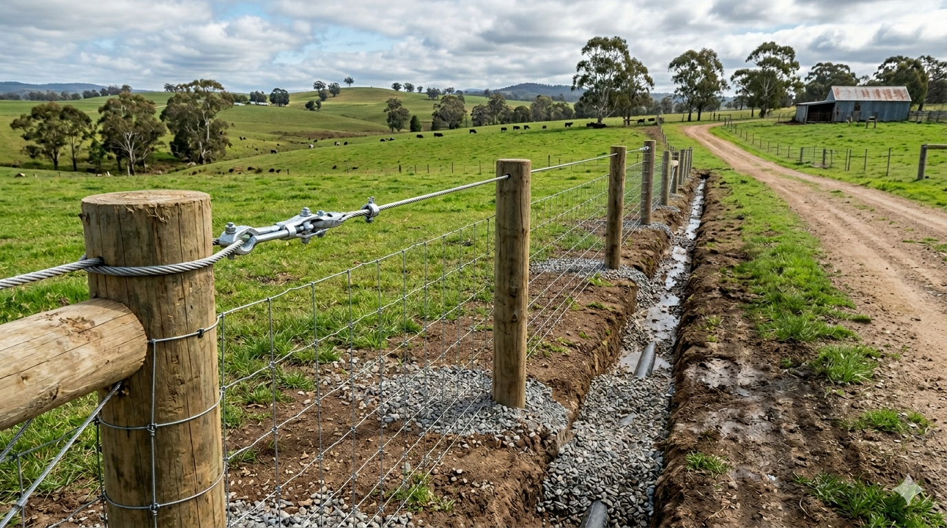 Proper drainage planning is essential for maintaining strong and durable fencing systems on Australian farms. Poor water management can lead to soil erosion, fence instability, and damage to livestock yards. By improving drainage around fence lines and yard areas, farmers can protect infrastructure, reduce maintenance costs, and support long-term farm productivity.